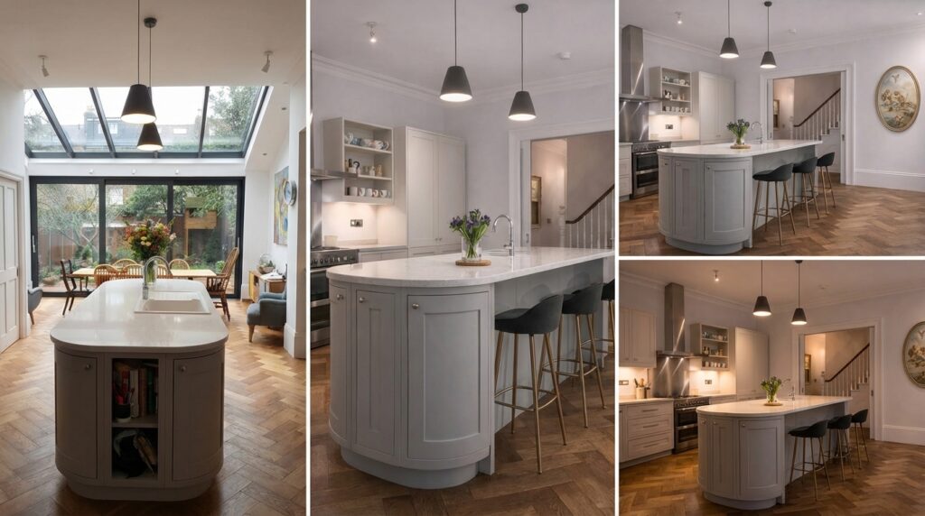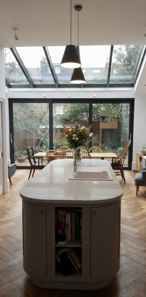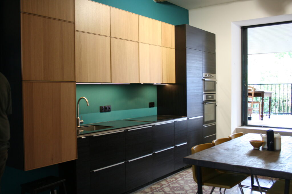 Restructuration et extension de la cuisine. Design. Colorimétrie. Ameublement.